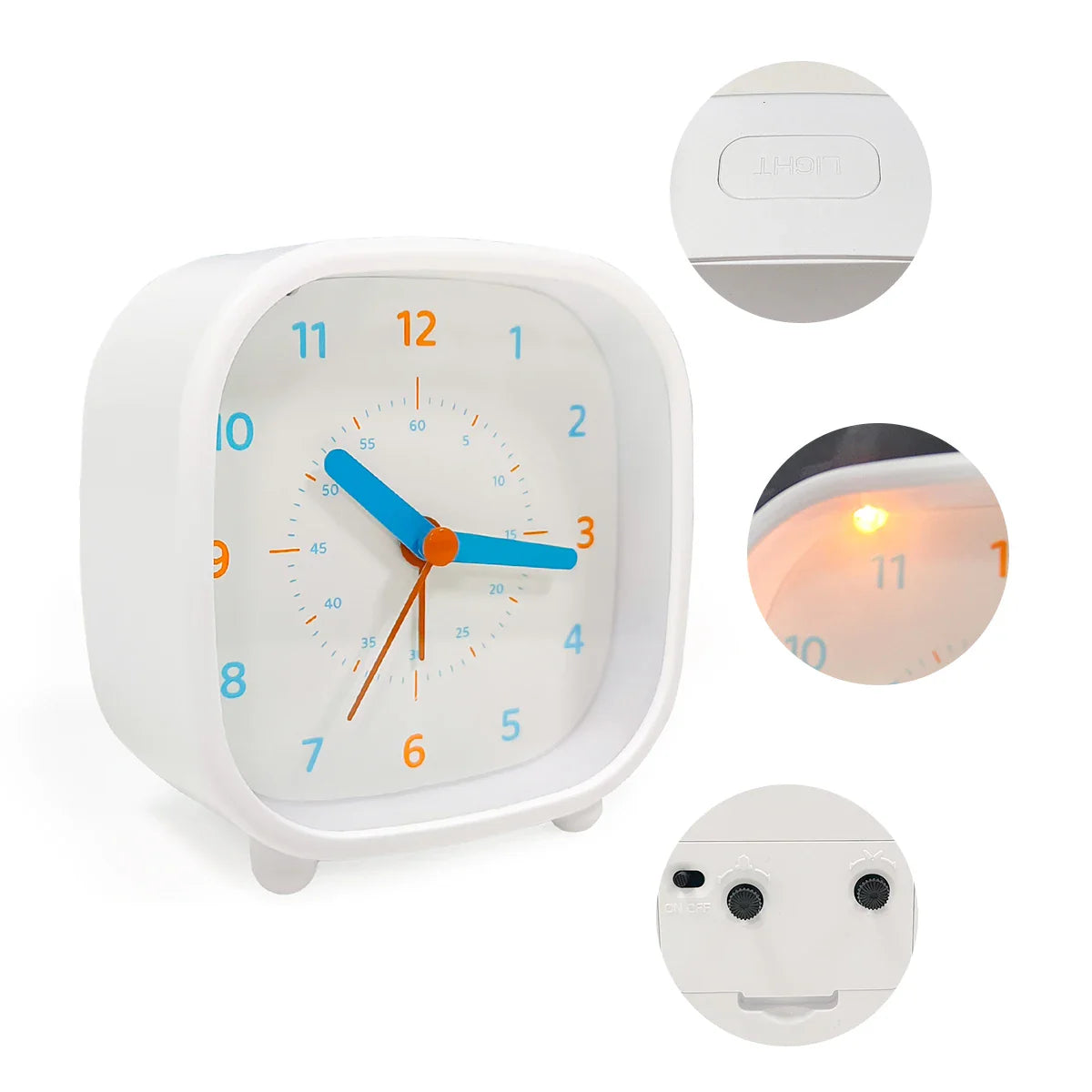 - Přehledný ciferník: Velká, barevná čísla a výrazné ručičky pro snadné čtení času i v šeru.