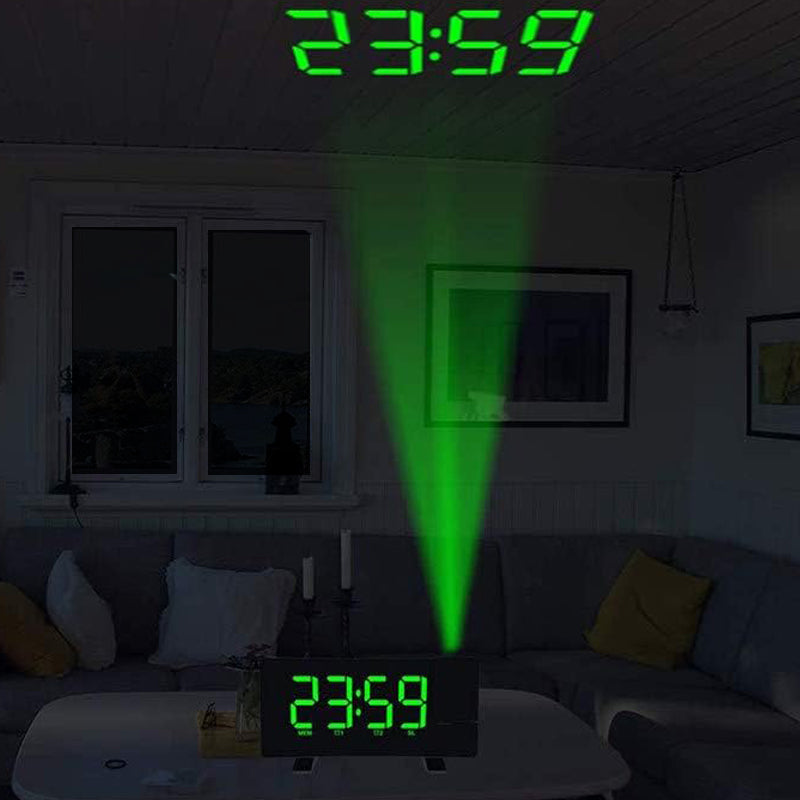 - Digitální projekce času: Jasné zelené zobrazení času na zdi nebo stropě pro snadnou kontrolu.
