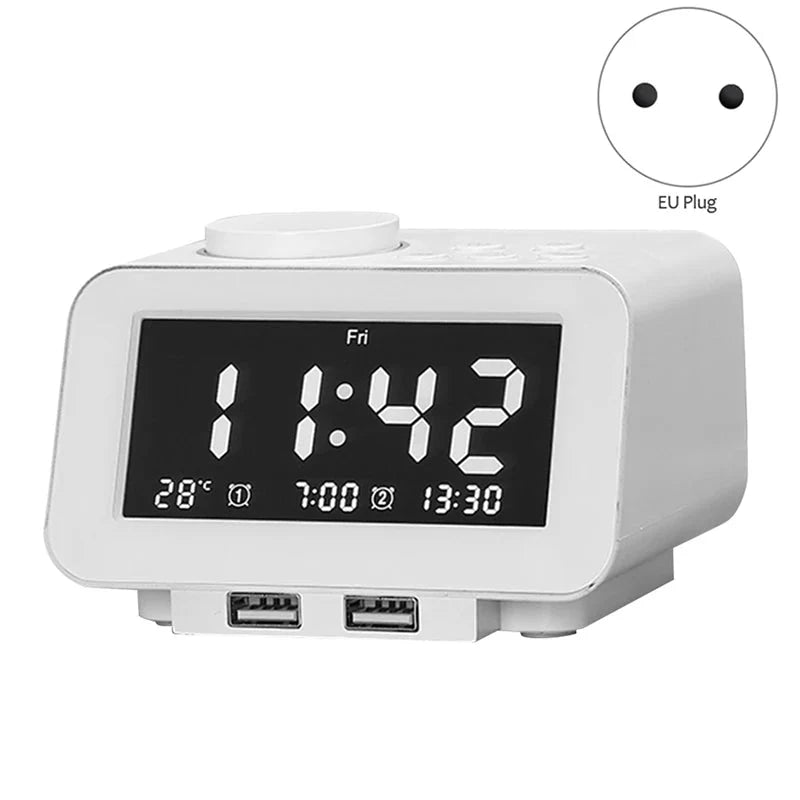 Náš multifunkční radiobudík je ideálním společníkem pro každé ráno. S elegantním bílým designem a velkým, snadno čitelným displejem se hodí do každé ložnice. Užijte si probouzení s vaší oblíbenou rádiovou stanicí díky integrovanému FM rádiu. Ale to není vše! Tento chytrý budík vám nejen ukáže čas a den (na obrázku je pátek 11:42), ale také venkovní teplotu (28°C) a dokonce i nastavené časy buzení (7:00 a 13:30). S dvěma USB porty na přední straně můžete pohodlně nabíjet váš telefon nebo jiné zařízení přímo u postele. Už žádné hledání volné zásuvky!