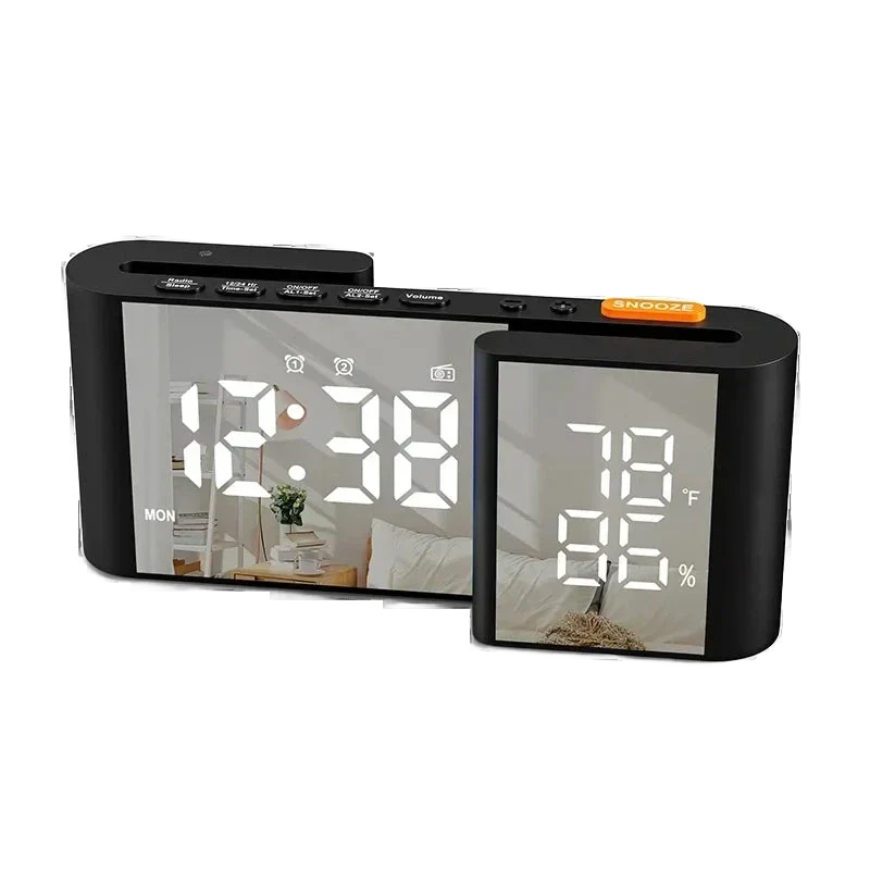 Tento unikátní radiobudík je navržen tak, aby splňoval všechny vaše ranní potřeby. Zrcadlový displej nejenže dodává zařízení luxusní a moderní vzhled, ale je i praktický pro rychlou kontrolu vašeho vzhledu před odchodem z ložnice. Velké, jasně čitelné LED číslice zajišťují, že čas uvidíte bez problémů i z dálky, ať už jste kdekoli v místnosti. S přesným teploměrem a vlhkoměrem budete vždy vědět, jaké je klima ve vaší místnosti, což vám pomůže lépe se připravit na den – vybrat správné oblečení nebo upravit topení. Funkce duálního alarmu je ideální pro páry nebo pro ty, kteří potřebují dva různé časy buzení. A díky vestavěnému digitálnímu FM rádiu se můžete probudit s vaší oblíbenou hudbou nebo ranními zprávami, místo nepříjemného bzučivého zvuku.