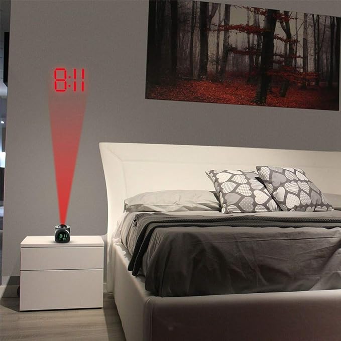 - Jasná projekce času: Čas se zobrazuje červeně na stropě nebo stěně pro snadné a okamžité čtení i v té nejhlubší noci.