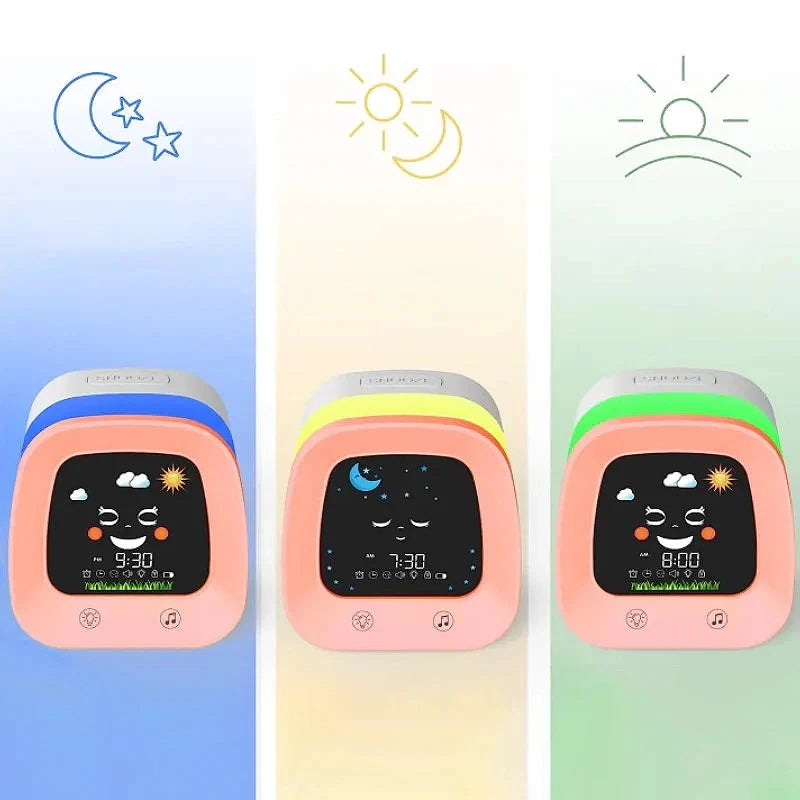 - Intuitivní vizuální signály: Roztomilá tvářička budíku s animacemi slunce a měsíce pro denní a noční režim, které dětem pomáhají snadno pochopit čas spánku a probuzení.
